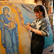 Muhteşem bir atölye, özenle hazırlanmış parçalar var. Sanatçı gerçekten mükemmel; duvara monte edilmiş, çok sayıda figürlü bir seramik parça üzerinde çalışıyordu - o kadar güzeldi ki! Kendisinden üç küçük parça aldık. Gözler için bir ziyafet. Antoine Fabienne Labbe